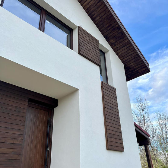 L'architecture de la maison en bois située à Chitila a 150 mètres carrés et a été conçue par l'architecte Ramona Barbu-Mocănescu et la structure a été conçue par Daniel Barbu-Mocănescu selon les principes éco-passifs d'efficacité énergétique et de durabilité. Nous avons été impliqués dans le projet avec la production et l'assemblage de la structure préfabriquée en bois pour la maison et le garage, mais aussi avec la toiture des fermes en bois de type grenier .